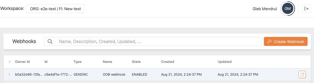 Click Create Webhook. The Owner ID will reflect the Financial Institution ID.