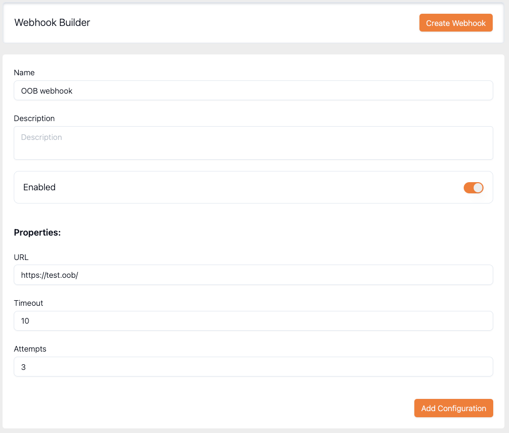 | Enabled | Yes | Toggle to enable/disable the webhook (enabled by default) |